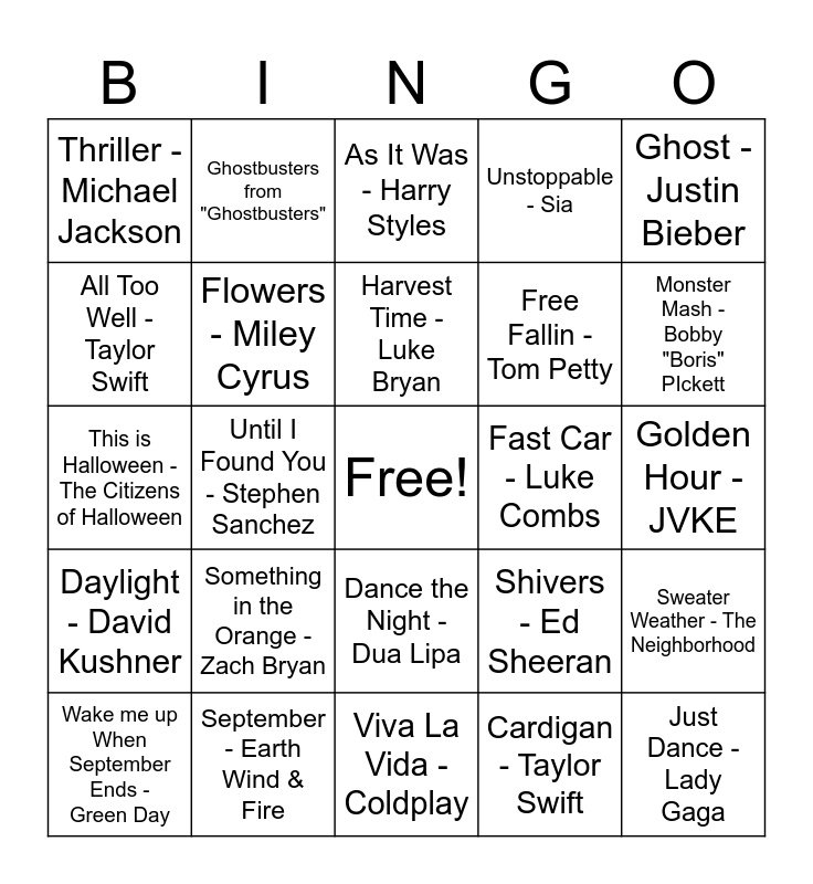 This bingo card has a free space and 28 words: Sweater Weather - The Neighborhood, Running Up That Hill - Kate Bush, Free Fallin - Tom Petty, Cardigan - Taylor Swift, All Too Well - Taylor Swift, As It Was - Harry Styles, Ghostbusters from "Ghostbusters", Daylight - David Kushner, Fast Car - Luke Combs, Wake me up When September Ends - Green Day, This is Halloween - The Citizens of Halloween, Unstoppable - Sia, September - Earth Wind & Fire, Viva La Vida - Coldplay, Monster Mash - Bobby "Boris" PIckett, Best Day of My Life - American Authors, Something in the Orange - Zach Bryan, Flowers - Miley Cyrus, Harvest Time - Luke Bryan, Dance the Night - Dua Lipa, Thriller - Michael Jackson, Calm Down - Rema, Selena Gomez, Just Dance - Lady Gaga, Until I Found You - Stephen Sanchez, Golden Hour - JVKE, Shivers - Ed Sheeran, Ghost - Justin Bieber and Sunflower- Post Malone.