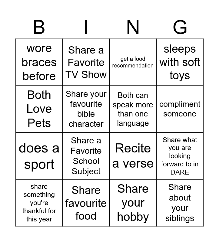 This bingo card has 17 words: Share your hobby, share something you're thankful for this year, get a food recommendation, wore braces before, Share a Favorite School Subject, sleeps with soft toys, Share what you are looking forward to in DARE, Both can speak more than one language, compliment someone, Share your favourite bible character, Share favourite food, Recite a verse, Both Love Pets, Share a Favorite TV Show, does a sport, love k dramas and Share about your siblings.