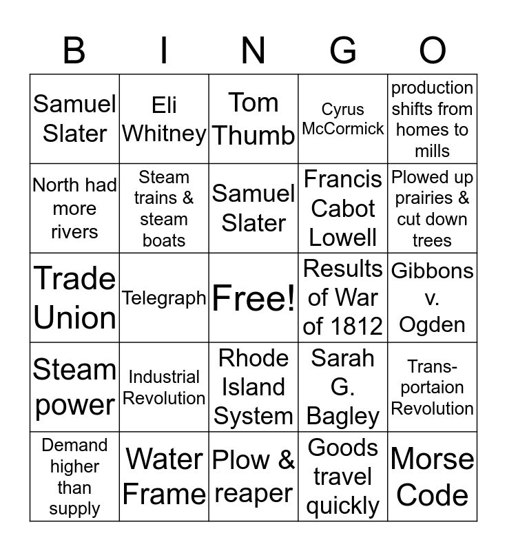 This bingo card has a free space and 24 words: Industrial Revolution, Water Frame, Samuel Slater, Demand higher than supply, production shifts from homes to mills, Samuel Slater, North had more rivers, Eli Whitney, Results of War of 1812, Rhode Island System, Francis Cabot Lowell, Trade Union, Sarah G. Bagley, Trans-portaion Revolution, Steam trains & steam boats, Goods travel quickly, Gibbons v. Ogden, Tom Thumb, Plowed up prairies & cut down trees, Telegraph, Morse Code, Steam power, Cyrus McCormick and Plow & reaper.