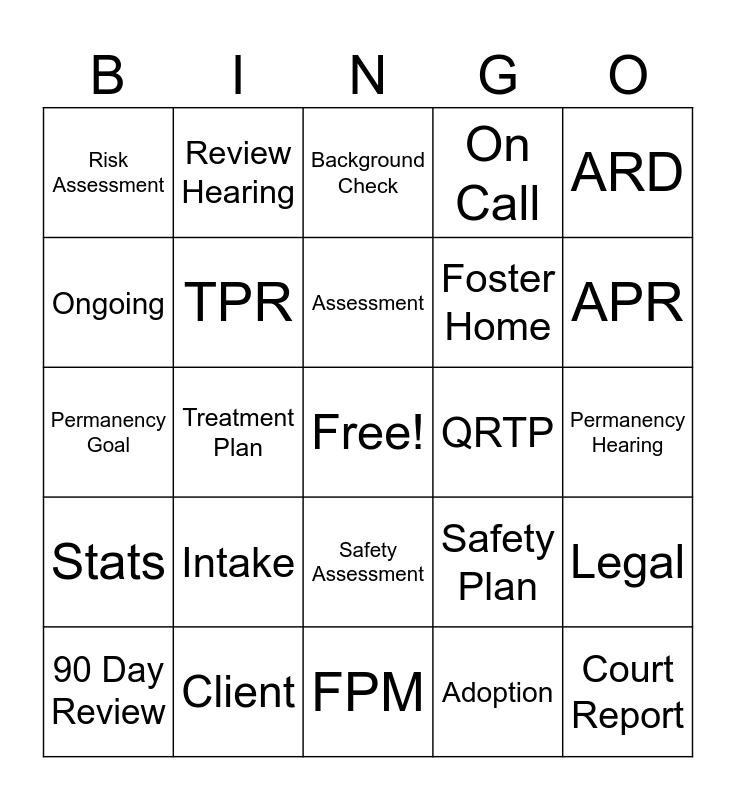 This bingo card has a free space and 24 words: Intake, Client, Assessment, 90 Day Review, ARD, Risk Assessment, Ongoing, Review Hearing, QRTP, Safety Assessment, Foster Home, Permanency Goal, Safety Plan, Legal, TPR, Adoption, Permanency Hearing, Background Check, APR, Treatment Plan, Court Report, Stats, On Call and FPM.