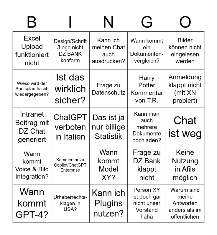 This bingo card has a free space and 24 words: Kommentar zu Copilot/ChatGPT Enterprise, Urheberrechts-klagen in USA?, Frage zu Datenschutz, Wann kommt GPT-4?, Bilder können nicht eingelesen werden, Excel Upload funktioniert nicht, Wieso wird der Speisplan falsch wiedergegeben?, Design/Schrift /Logo nicht DZ BANK konform, Kann man auch mehrere Dokumente hochladen?, Wann kommt Model XY?, Harry Potter Kommentar von T.R., Intranet Beitrag mit DZ Chat generiert, Frage zu DZ Bank klappt nicht, Keine Nutzung in Afils möglich, Ist das wirklich sicher?, Person XY ist doch gar nicht unser Vorstand haha, Chat ist weg, Kann ich meinen Chat auch ausdrucken?, Anmeldung klappt nicht (mit XN probiert), ChatGPT verboten in Italien, Warum sind meine Antworten anders als im öffentlichen, Wann kommt Voice & Bild Integration?, Wann kommt ein Dokumenten-vergleich? and Kann ich Plugins nutzen?.