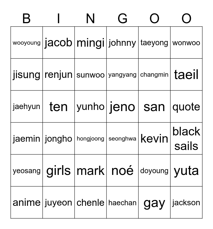 This bingo card has 36 words: noé, mark, haechan, jisung, jaemin, jeno, renjun, chenle, taeyong, doyoung, taeil, johnny, yuta, ten, yangyang, wooyoung, yeosang, san, jaehyun, mingi, yunho, jongho, seonghwa, hongjoong, kevin, jacob, changmin, juyeon, sunwoo, wonwoo, jackson, anime, black sails, quote, girls and gay.