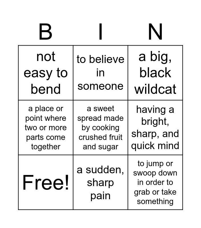 This bingo card has 9 words: Free!, a big, black wildcat, to believe in someone, a place or point where two or more parts come together, not easy to bend, having a bright, sharp, and quick mind, a sweet spread made by cooking crushed fruit and sugar, to jump or swoop down in order to grab or take something and a sudden, sharp pain.