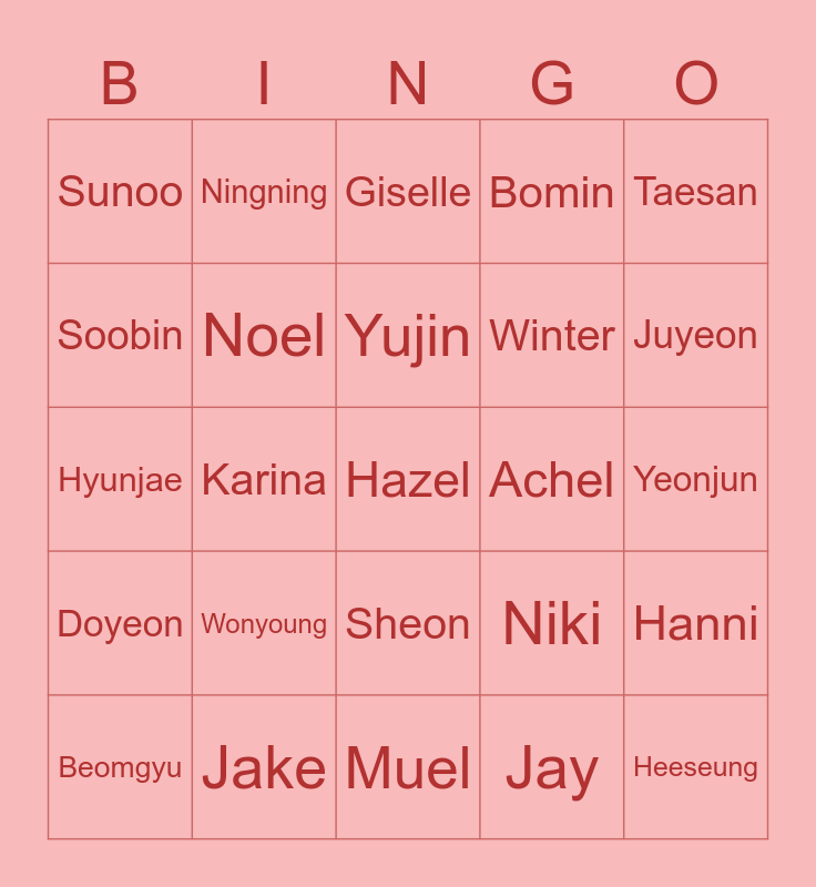 This bingo card has a free space and 24 words: Wonyoung, Jake, Yujin, Beomgyu, Taesan, Sunoo, Soobin, Ningning, Achel, Sheon, Winter, Hyunjae, Niki, Hanni, Noel, Jay, Yeonjun, Giselle, Juyeon, Karina, Heeseung, Doyeon, Bomin and Muel.