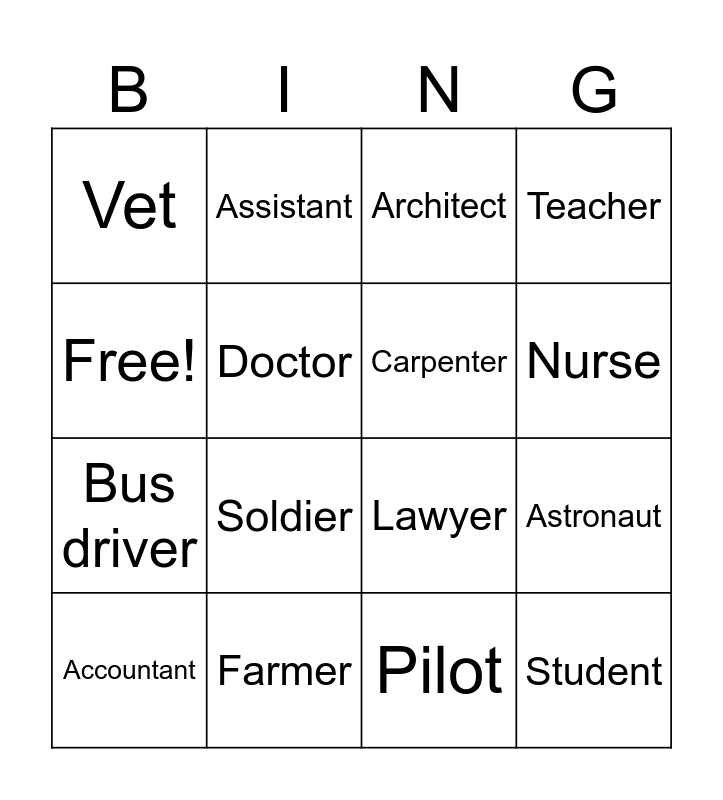 This bingo card has 16 words: Farmer, Astronaut, Architect, Vet, Bus driver, Assistant, Lawyer, Pilot, Free!, Doctor, Accountant, Teacher, Soldier, Nurse, Carpenter and Student.