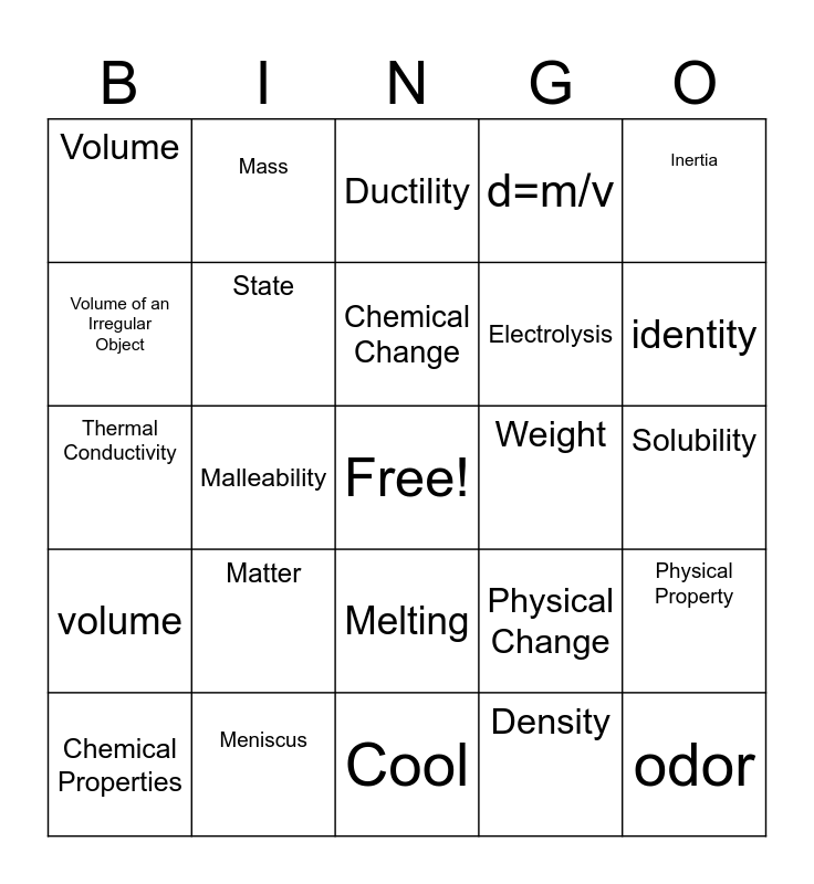 This bingo card has a free space and 24 words: Matter, Meniscus, Chemical Change, Chemical Properties, Inertia, Volume, Volume of an Irregular Object, Mass, Weight, Melting, Electrolysis, Thermal Conductivity, Physical Change, Physical Property, State, Density, Solubility, Ductility, identity, Malleability, odor, volume, d=m/v and Cool.