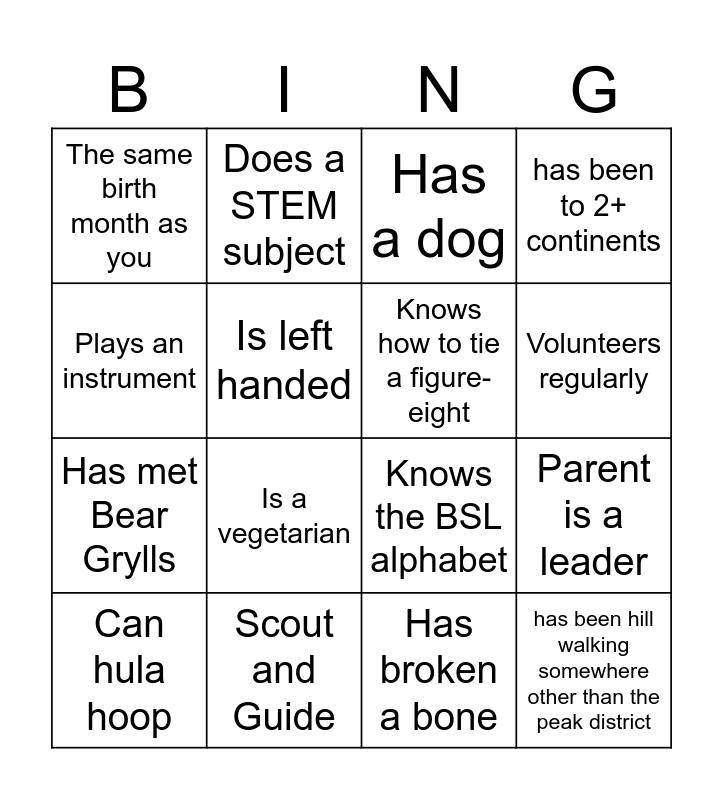 This bingo card has 16 words: Scout and Guide, Parent is a leader, Has a dog, The same birth month as you, Has met Bear Grylls, Does a STEM subject, Knows the BSL alphabet, Has broken a bone, Plays an instrument, Is left handed, Can hula hoop, has been to 2+ continents, Is a vegetarian, Volunteers regularly, Knows how to tie a figure-eight and has been hill walking somewhere other than the peak district.