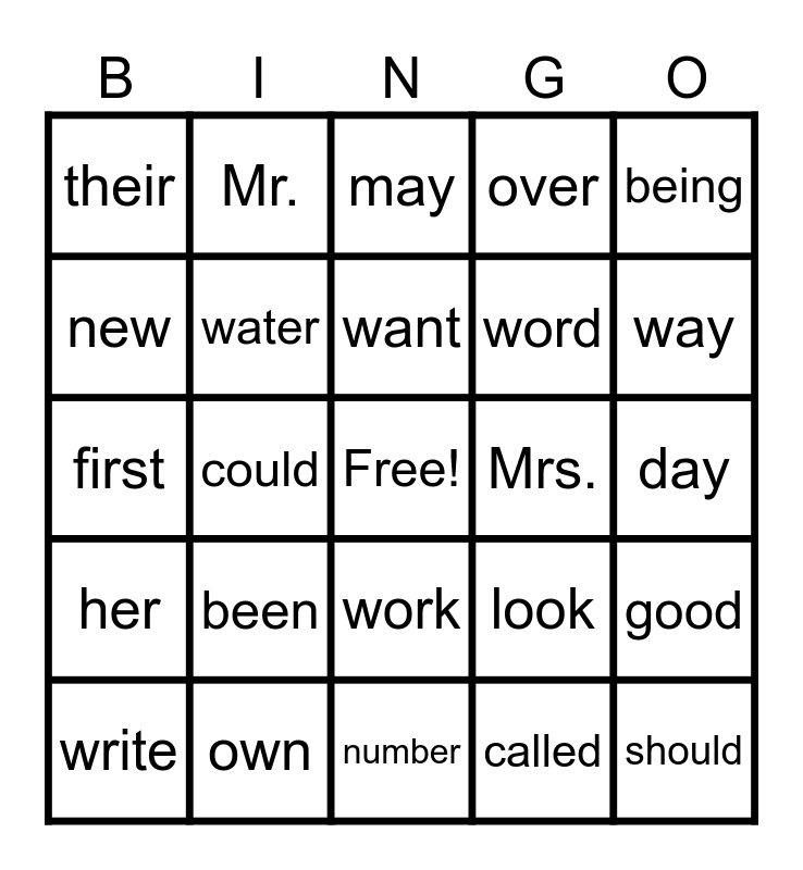 This bingo card has a free space and 24 words: been, own, want, write, being, their, new, Mr., Mrs., work, word, first, look, good, water, called, day, may, way, could, should, her, over and number.