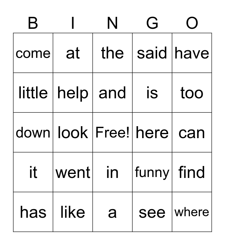This bingo card has a free space and 24 words: went, like, and, has, have, come, little, at, here, in, is, down, funny, find, help, see, can, the, too, look, where, it, said and a.