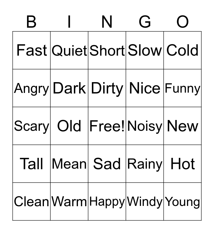 This bingo card has a free space and 24 words: Mean, Warm, Dirty, Clean, Cold, Fast, Angry, Quiet, Noisy, Sad, Nice, Scary, Rainy, Hot, Dark, Windy, New, Short, Funny, Old, Young, Tall, Slow and Happy.