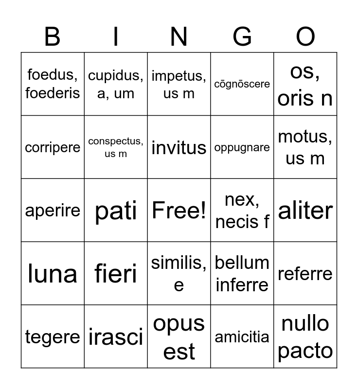This bingo card has a free space and 24 words: fieri, irasci, invitus, tegere, os, oris n, foedus, foederis, corripere, cupidus, a, um, nex, necis f, similis, e, oppugnare, aperire, bellum inferre, referre, conspectus, us m, amicitia, aliter, impetus, us m, motus, us m, pati, nullo pacto, luna, cōgnōscere and opus est.