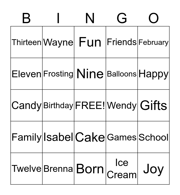 This bingo card has a free space and 24 words: Isabel, Brenna, Nine, Twelve, February, Thirteen, Eleven, Wayne, Wendy, Cake, Balloons, Candy, Games, School, Frosting, Ice Cream, Gifts, Fun, Happy, Birthday, Joy, Family, Friends and Born.