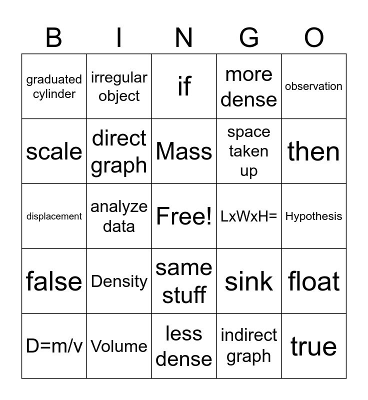 This bingo card has a free space and 24 words: Density, Volume, Mass, D=m/v, observation, graduated cylinder, scale, irregular object, LxWxH=, same stuff, space taken up, displacement, sink, float, direct graph, indirect graph, Hypothesis, if, then, analyze data, true, false, more dense and less dense.