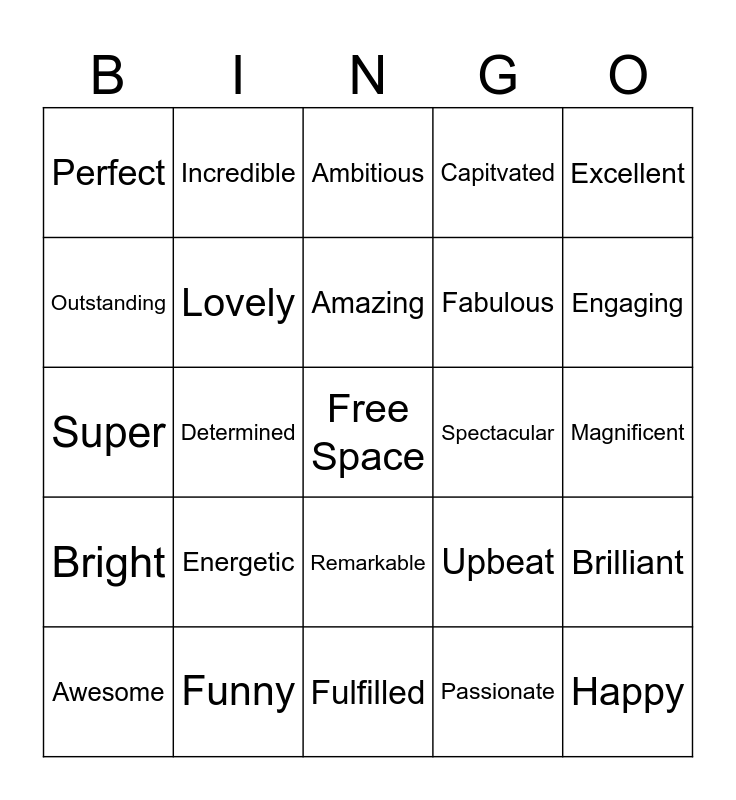 This bingo card has a free space and 24 words: Energetic, Funny, Amazing, Awesome, Excellent, Perfect, Outstanding, Incredible, Spectacular, Remarkable, Fabulous, Super, Upbeat, Brilliant, Lovely, Passionate, Magnificent, Ambitious, Engaging, Determined, Happy, Bright, Capitvated and Fulfilled.