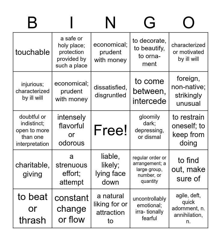 This bingo card has a free space and 24 words: a strenuous effort; attempt, constant change or flow, dissatisfied, disgruntled, to beat or thrash, characterized or motivated by ill will, touchable, injurious; characterized by ill will, a safe or holy place; protection provided by such a place, gloomily dark; depressing, or dismal, liable, likely; lying face down, to come between, intercede, doubtful or indistinct; open to more than one interpretation, regular order or arrangement; a large group, number, or quantity, to find out, make sure of, economical; prudent with money, uncontrollably emotional; irra- tionally fearful, to restrain oneself; to keep from doing, economical; prudent with money, foreign, non-native; strikingly unusual, intensely flavorful or odorous, agile, deft, quick adornment, n. annihilation, n., charitable, giving, to decorate, to beautify, to orna- ment and a natural liking for or attraction to.