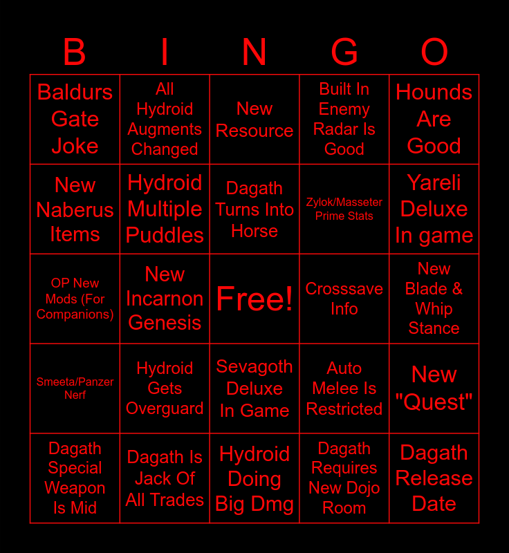 This bingo card has a free space and 24 words: Hydroid Gets Overguard, Dagath Is Jack Of All Trades, Dagath Turns Into Horse, Dagath Special Weapon Is Mid, Hounds Are Good, Baldurs Gate Joke, New Naberus Items, All Hydroid Augments Changed, Crosssave Info, Sevagoth Deluxe In Game, Zylok/Masseter Prime Stats, OP New Mods (For Companions), Auto Melee Is Restricted, New "Quest", Hydroid Multiple Puddles, Dagath Requires New Dojo Room, New Blade & Whip Stance, New Resource, Yareli Deluxe In game, New Incarnon Genesis, Dagath Release Date, Smeeta/Panzer Nerf, Built In Enemy Radar Is Good and Hydroid Doing Big Dmg.
