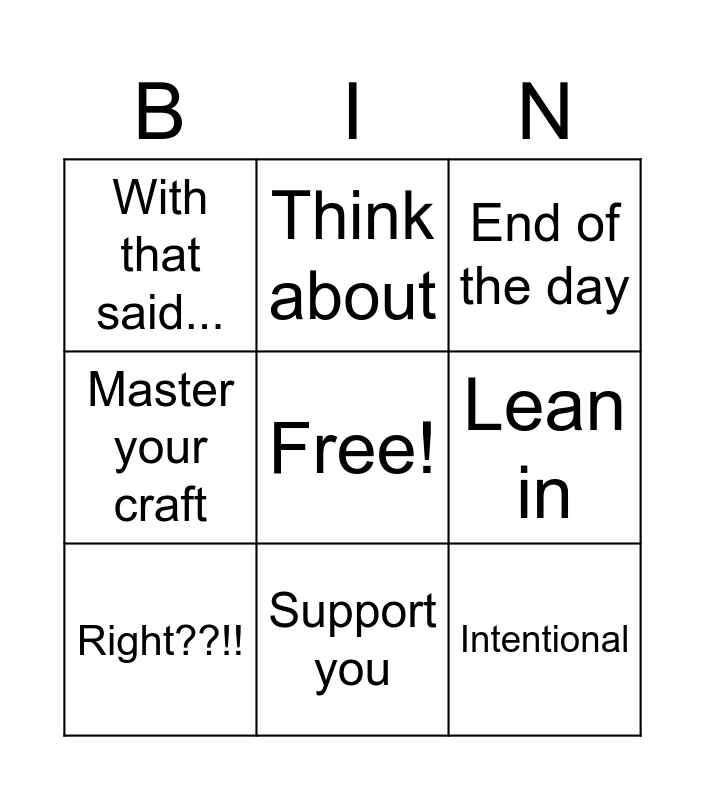 This bingo card has a free space and 8 words: Lean in, End of the day, Think about, Right??!!, With that said..., Intentional, Master your craft and Support you.