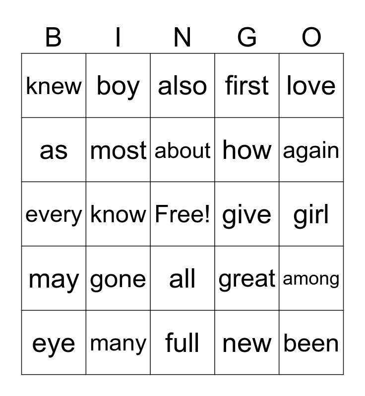 This bingo card has a free space and 24 words: gone, many, about, eye, love, knew, as, boy, give, all, how, every, great, among, most, new, girl, also, again, know, been, may, first and full.
