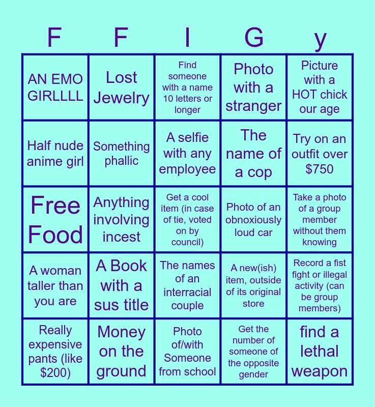 This bingo card has a free space and 24 words: Really expensive pants (like $200), A Book with a sus title, A selfie with any employee, Get the number of someone of the opposite gender, Picture with a HOT chick our age, AN EMO GIRLLLL, Lost Jewelry, Find someone with a name 10 letters or longer, Photo of an obnoxiously loud car, Take a photo of a group member without them knowing, Free Food, Something phallic, A new(ish) item, outside of its original store, Record a fist fight or illegal activity (can be group members), Half nude anime girl, Money on the ground, Photo of/with Someone from school, Photo with a stranger, Try on an outfit over $750, A woman taller than you are, Anything involving incest, The names of an interracial couple, The name of a cop and find a lethal weapon.