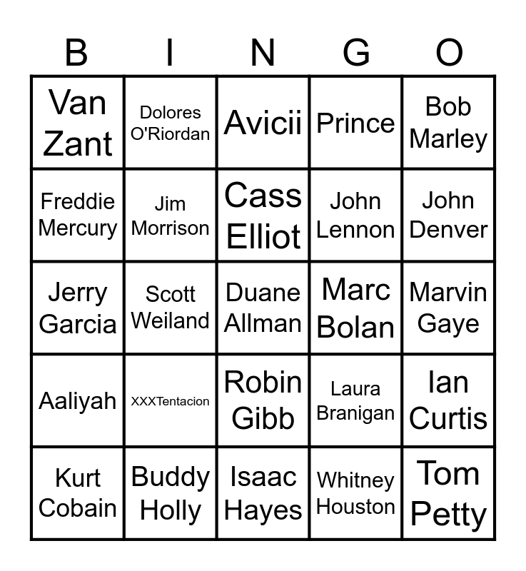 This bingo card has 60 words: Amy Winehouse, Buddy Holly, Janis Joplin, Aaliyah, Whitney Houston, Jimi Hendrix, Jim Morrison, Michael Jackson, John Lennon, Elvis Presley, Prince, George Michael, Freddie Mercury, Karen Carpenter, Otis Redding, Van Zant, Duane Allman, Bob Marley, Chris Cornell, Cass Elliot, Marc Bolan, Avicii, Kurt Cobain, Ian Curtis, Tina Turner, Mac Miller, Ronnie Van Zant, Jimmy Buffet, John Denver, Stevie Ray Vaughan, Ricky Nelson, Nat King Cole, Sam Cooke, Billie Holiday, Dolores O'Riordan, Chester Bennington, Leonard Cohen, Scott Weiland, Elliot Smith, Jerry Garcia, Joey Ramone, XXXTentacion, Marvin Gaye, Lil Peep, Laura Branigan, Johnny Cash, Ray Charles, John Entwistle, Dan Folgerberg, Robin Gibb, Isaac Hayes, Rick James, Peggy Lee, Robert Palmer, Joe Strummer, Luther Vandross, Warren Zevon, Aretha Franklin, Tom Petty and Chuck Berry.