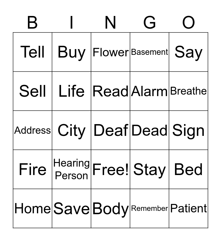 This bingo card has 26 words: Free!, Remember, Read, Save, Say, Tell, Sell, Buy, Sign, Stay, Alarm, Address, Bed, Home, City, Village, Basement, Fire, Flower, Deaf, Breathe, Body, Dead, Hearing Person, Life and Patient.