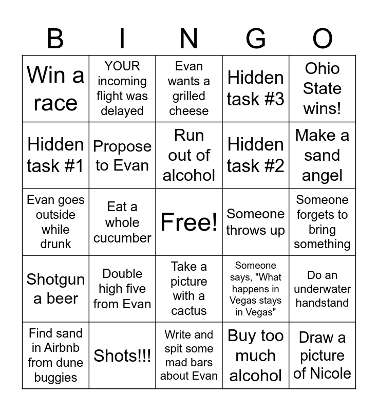This bingo card has a free space and 24 words: Double high five from Evan, Shots!!!, Run out of alcohol, Find sand in Airbnb from dune buggies, Ohio State wins!, Win a race, Hidden task #1, YOUR incoming flight was delayed, Someone throws up, Take a picture with a cactus, Hidden task #2, Evan goes outside while drunk, Someone says, "What happens in Vegas stays in Vegas", Do an underwater handstand, Propose to Evan, Buy too much alcohol, Someone forgets to bring something, Evan wants a grilled cheese, Make a sand angel, Eat a whole cucumber, Draw a picture of Nicole, Shotgun a beer, Hidden task #3 and Write and spit some mad bars about Evan.