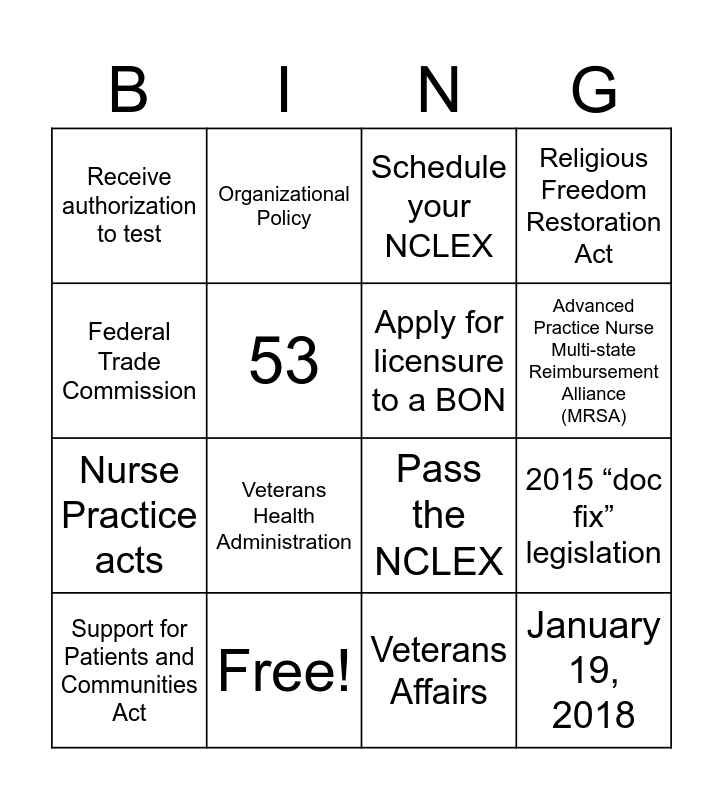 This bingo card has 22 words: Free!, Nursing Boards, Organizational Policy, State Level, 53, Apply for licensure to a BON, Receive authorization to test, Schedule your NCLEX, Pass the NCLEX, January 19, 2018, Nurse Practice acts, Religious Freedom Restoration Act, Consent order, Discipline by Consent, Veterans Affairs, National Academy of Medicine, 2015 “doc fix” legislation, Support for Patients and Communities Act, Veterans Health Administration, Federal Trade Commission, Advanced Practice Nurse Multi-state Reimbursement Alliance (MRSA) and Loretta Ford.