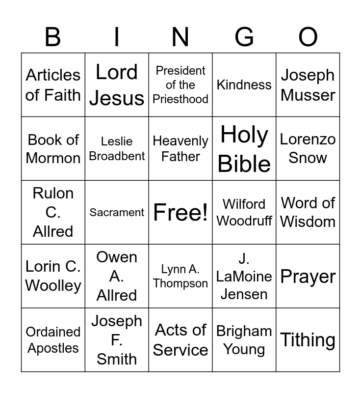 This bingo card has a free space and 34 words: Joseph Smith, Brigham Young, John Taylor, John W. Woolley, Lorin C. Woolley, Leslie Broadbent, Joseph Musser, Ordained Apostles, Lord Jesus, Holy Ghost, Heavenly Father, President of the Priesthood, Salt Lake City, Latter Day Saints, Wilford Woodruff, Lorenzo Snow, Joseph F. Smith, Rulon C. Allred, Owen A. Allred, J. LaMoine Jensen, Lynn A. Thompson, David G. Watson, Articles of Faith, Word of Wisdom, Acts of Service, Tithing, Kindness, Love, Holy Bible, Book of Mormon, Testimony, Sacrament, Prayer and Faith.