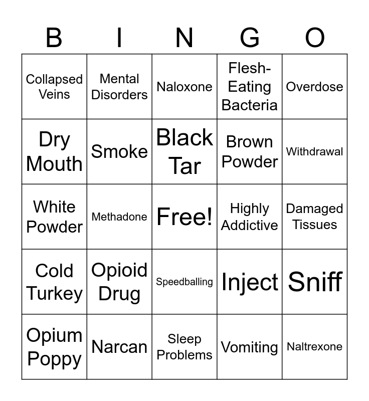 This bingo card has a free space and 24 words: Opioid Drug, Narcan, Black Tar, Opium Poppy, Overdose, Collapsed Veins, Dry Mouth, Mental Disorders, Highly Addictive, Speedballing, Brown Powder, White Powder, Inject, Sniff, Smoke, Vomiting, Damaged Tissues, Naloxone, Withdrawal, Methadone, Naltrexone, Cold Turkey, Flesh-Eating Bacteria and Sleep Problems.