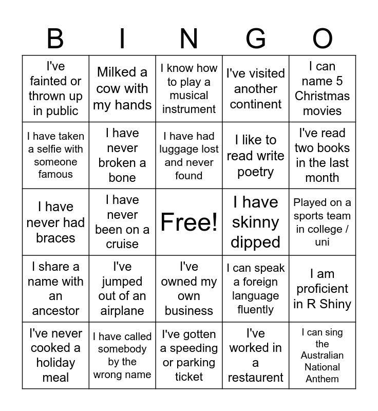 This bingo card has a free space and 24 words: I've jumped out of an airplane, I have called somebody by the wrong name, I have had luggage lost and never found, I've never cooked a holiday meal, I can name 5 Christmas movies, I've fainted or thrown up in public, I have taken a selfie with someone famous, Milked a cow with my hands, I have skinny dipped, I've owned my own business, I like to read write poetry, I have never had braces, I can speak a foreign language fluently, I am proficient in R Shiny, I have never broken a bone, I've worked in a restaurent, Played on a sports team in college / uni, I know how to play a musical instrument, I've read two books in the last month, I have never been on a cruise, I can sing the Australian National Anthem, I share a name with an ancestor, I've visited another continent and I've gotten a speeding or parking ticket.