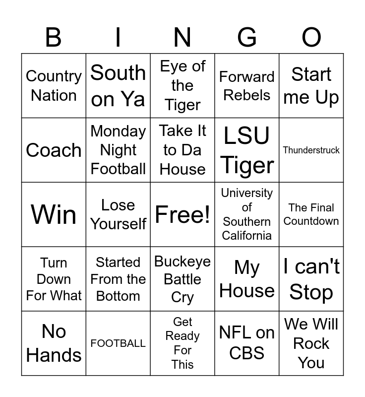 This bingo card has a free space and 24 words: Started From the Bottom, FOOTBALL, Take It to Da House, No Hands, Start me Up, Country Nation, Coach, South on Ya, University of Southern California, Buckeye Battle Cry, LSU Tiger, Win, My House, I can't Stop, Monday Night Football, NFL on CBS, The Final Countdown, Eye of the Tiger, Thunderstruck, Lose Yourself, We Will Rock You, Turn Down For What, Forward Rebels and Get Ready For This.