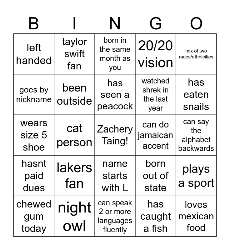 This bingo card has a free space and 31 words: can speak 2 or more languages fluently, wears contacts/glasses, cat person, has read the entire harry potter series, left handed, born in the same month as you, been outside, born out of state, can do jamaican accent, has caught a fish, can say the alphabet backwards, loves mexican food, wearing the same color as you, can whistle, has eaten snails, first year in key club, plays a sport, lakers fan, hasnt paid dues, name starts with L, mix of two races/ethnicities, can do 10 pushups, chewed gum today, taylor swift fan, watched shrek in the last year, goes by nickname, 20/20 vision, wears size 5 shoe, night owl, has seen a peacock and fortnite.