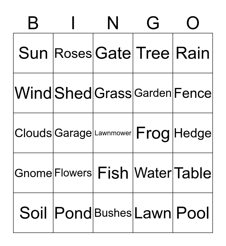 This bingo card has a free space and 24 words: Flowers, Pond, Grass, Soil, Rain, Sun, Wind, Roses, Frog, Fish, Garden, Clouds, Water, Table, Shed, Lawn, Hedge, Gate, Fence, Garage, Pool, Gnome, Tree and Bushes.