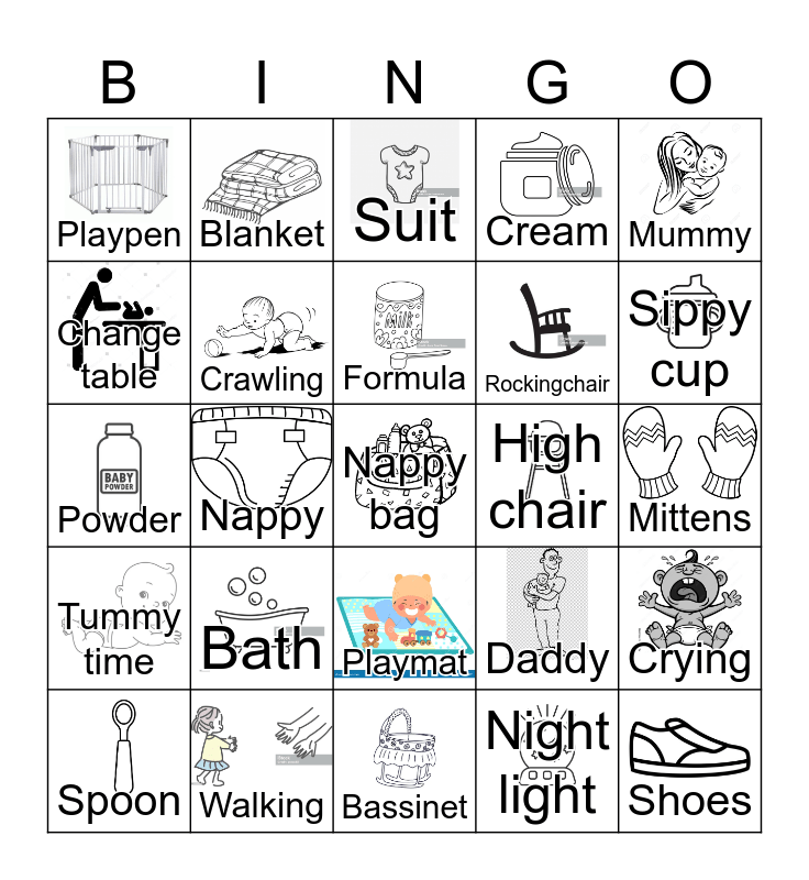 This bingo card has 49 images and 51 words: Free!, Nappy bag, Toys, Bassinet, Bath, Bib, Blanket, Bouncinette, Change table, Cot, Crawling, Cream, Crying, Daddy, Due date, Eating, Formula, High chair, Mobile, Mummy, Nappy, Night light, Playpen, Rockingchair, Ducky, Shoes, Sippy cup, Sleeping, Spoon, Suit, Swing, Teddy, Tooth, Twins, Ultrasound, Walking, Wipes, Booties, Bottle, Dummy, Mittens, Tummy time, Monitor, Pram, Rolling, Carrier, Powder, Book, Carseat, Playmat and Triplets.