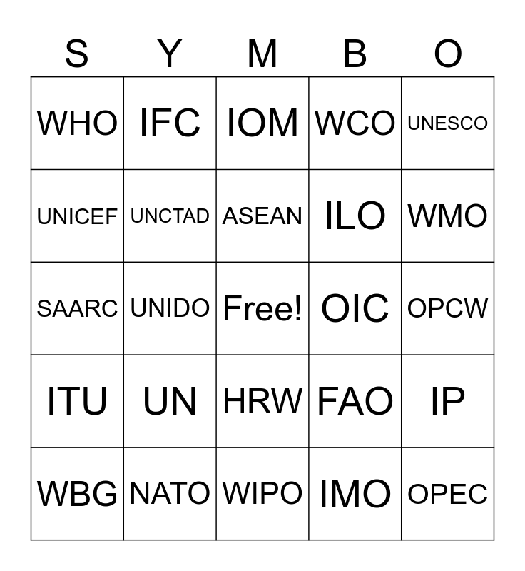 This bingo card has a free space and 24 words: UN, NATO, ASEAN, WBG, UNESCO, WHO, UNICEF, IFC, OIC, HRW, ILO, SAARC, FAO, IP, UNCTAD, IMO, OPCW, IOM, WMO, UNIDO, OPEC, ITU, WCO and WIPO.