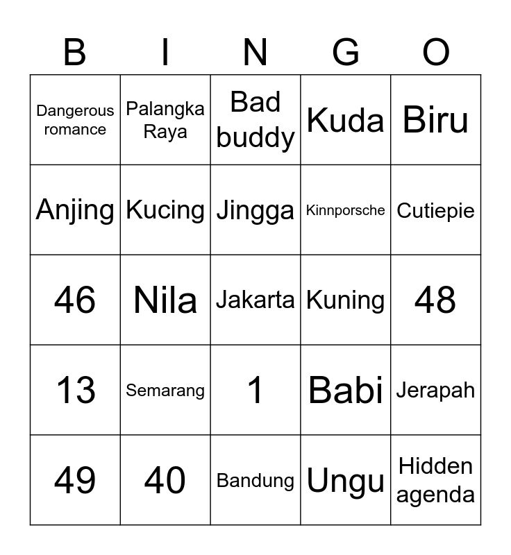 This bingo card has 50 words: Free!, Jakarta, Banten, Bandung, Semarang, Bali, Palangka Raya, Gorontalo, Anjing, Gajah, Kucing, Kuda, Jerapah, Babi, Singa, Merah, Jingga, Kuning, Hijau, Biru, Nila, Ungu, Dangerous romance, Kinnporsche, Eclipse, Hidden agenda, Cutiepie, Bedfriends, Bad buddy, 1, 13, 19, 30, 27, 40, 38, 29, 20, 32, 48, 37, 26, 00, 50, 49, 46, 53, 6, 13 and 4.
