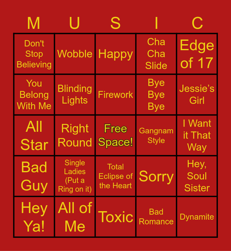 This bingo card has a free space and 58 words: A Thousand Miles, All of Me, Another One Bites the Dust, Bad Guy, Bad Romance, Barbie Girl, Blinding Lights, Bohemian Rhapsody, Bye Bye Bye, Call Me Maybe, Cha Cha Slide, Cotton Eyed Joe, Counting Stars, Dancing Queen, Despacito, Don't Stop Believing, Dynamite, Edge of 17, Eye of the Tiger, Firework, Gangnam Style, Happy, Hey Ya!, Hey, Soul Sister, Hit Me Baby One More Time, I Want it That Way, I Will Always Love You, In the End, Jessie’s Girl, Just The Way You Are, Like a Prayer, Lose Yourself, Macarena, Old Town Road, Party in the USA, Push It, Respect, Right Round, All Star, Since You Been Gone, Single Ladies (Put a Ring on it), Someone Like You, Sorry, Starships, The Edge of Glory, Tik Tok, Titanium, Total Eclipse of the Heart, Toxic, U Can’t Touch This, Uptown Funk, Wannabe, We Will Rock You, What Makes You Beautiful, Wobble, Y.M.C.A., You Belong With Me and Ghost.