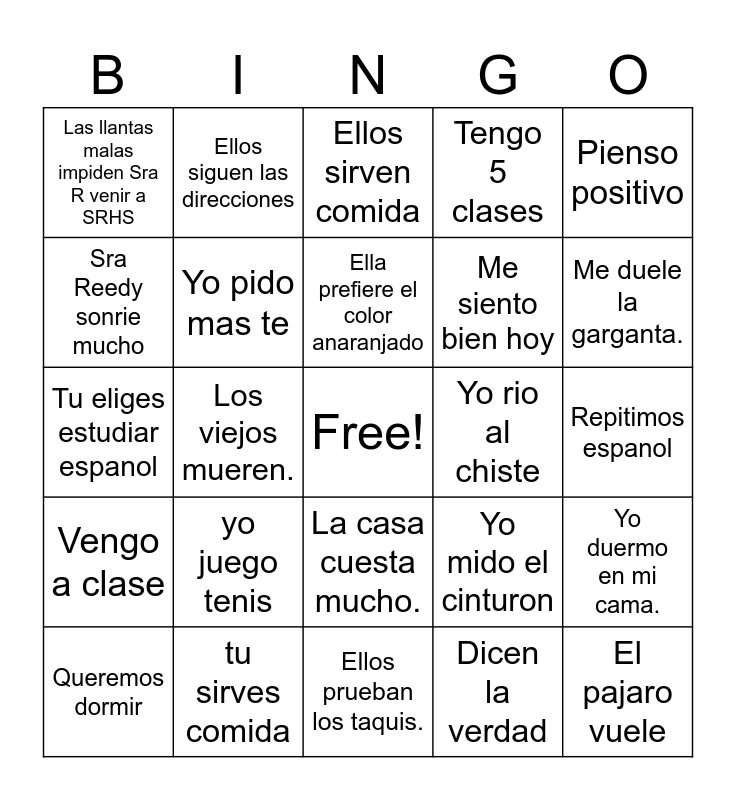 This bingo card has a free space and 24 words: yo juego tenis, tu sirves comida, Ella prefiere el color anaranjado, Queremos dormir, Pienso positivo, Las llantas malas impiden Sra R venir a SRHS, Sra Reedy sonrie mucho, Ellos siguen las direcciones, Yo rio al chiste, La casa cuesta mucho., Me siento bien hoy, Tu eliges estudiar espanol, Yo mido el cinturon, Yo duermo en mi cama., Yo pido mas te, Dicen la verdad, Repitimos espanol, Ellos sirven comida, Me duele la garganta., Los viejos mueren., El pajaro vuele, Vengo a clase, Tengo 5 clases and Ellos prueban los taquis..