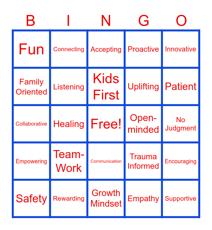 This bingo card has a free space and 24 words: Team-Work, Rewarding, Kids First, Safety, Innovative, Fun, Family Oriented, Connecting, Open-minded, Communication, Uplifting, Collaborative, Trauma Informed, Encouraging, Listening, Empathy, No Judgment, Accepting, Patient, Healing, Supportive, Empowering, Proactive and Growth Mindset.