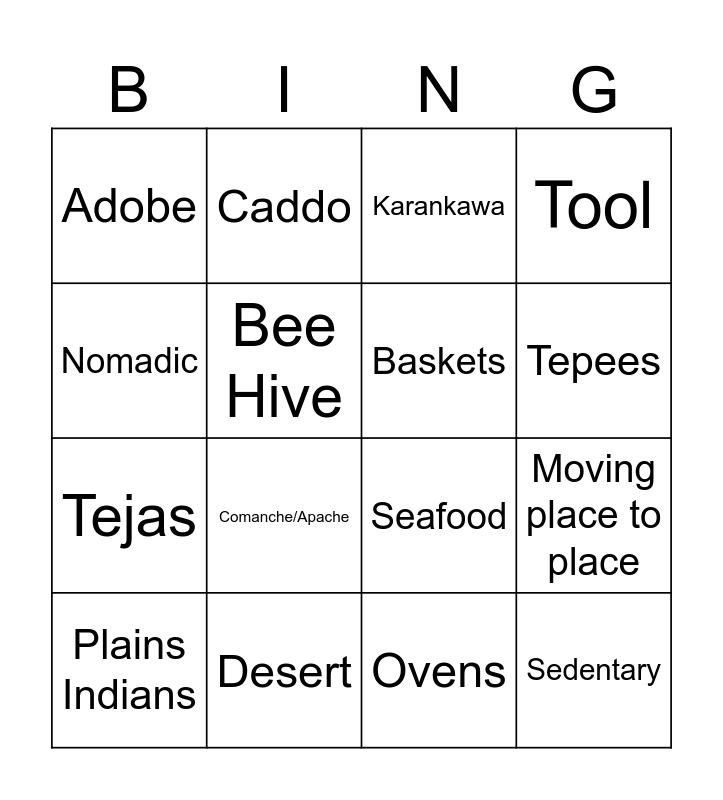 This bingo card has 23 words: Sedentary, Pueblo, Tepees, Coastal Plains, Nomadic, Adobe, Bee Hive, Caddo, Plains Indians, Farmers, Comanche/Apache, Tejas, Gulf, Buffalo, Desert, Skilled Horse riders, Karankawa, Seafood, Baskets, Moving place to place, Tool, Ovens and Jumano.