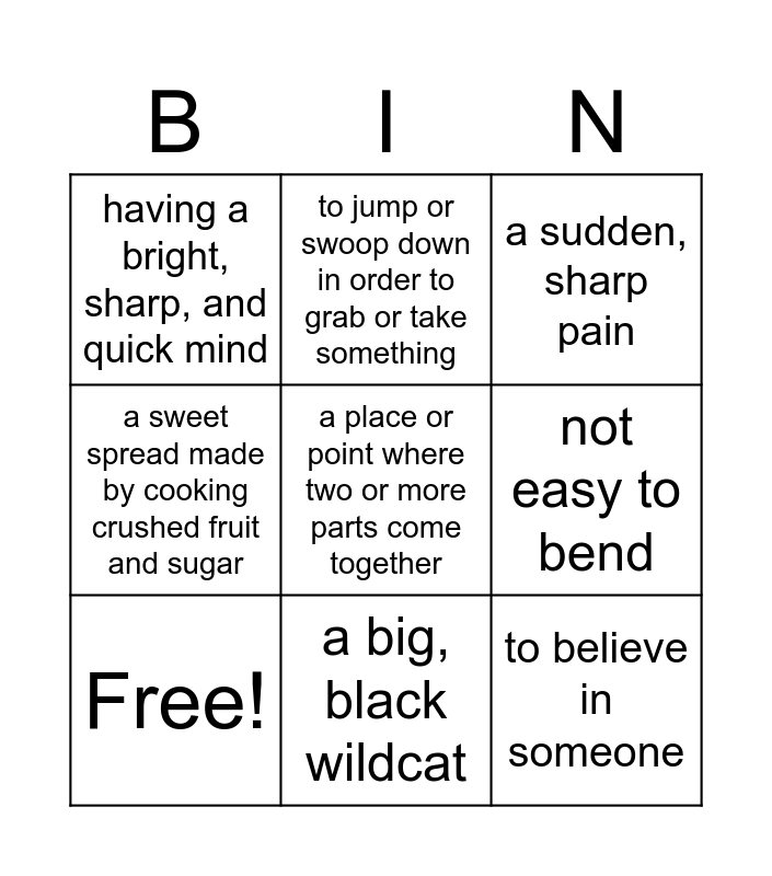 This bingo card has 9 words: Free!, a sudden, sharp pain, to jump or swoop down in order to grab or take something, a sweet spread made by cooking crushed fruit and sugar, having a bright, sharp, and quick mind, not easy to bend, a place or point where two or more parts come together, to believe in someone and a big, black wildcat.