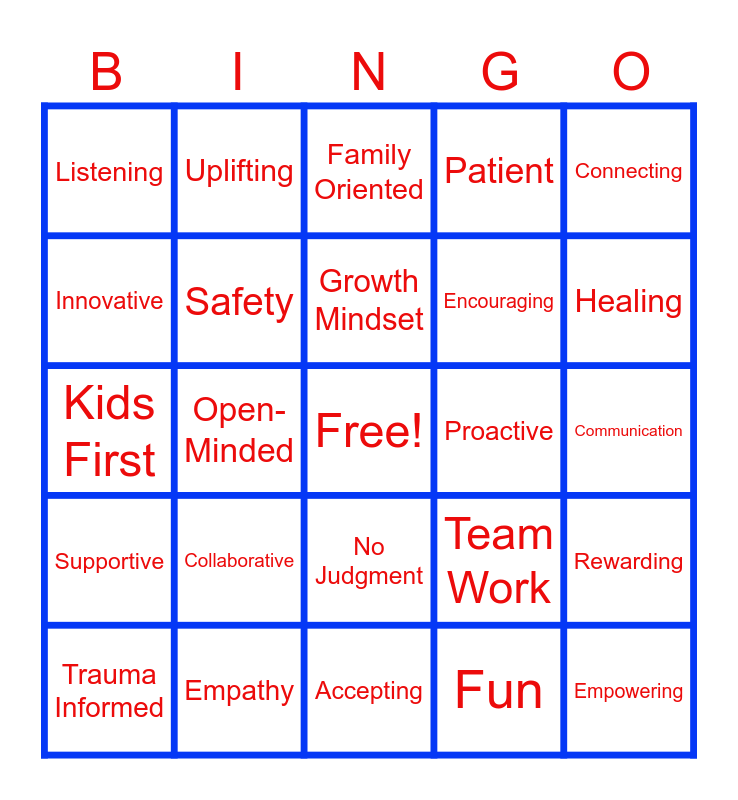 This bingo card has a free space and 24 words: Collaborative, Empathy, Growth Mindset, Trauma Informed, Connecting, Listening, Innovative, Uplifting, Proactive, No Judgment, Encouraging, Kids First, Team Work, Rewarding, Safety, Fun, Communication, Family Oriented, Healing, Open-Minded, Empowering, Supportive, Patient and Accepting.
