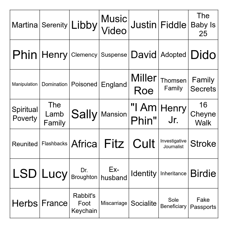 This bingo card has 49 words: Inheritance, Adopted, Socialite, The Lamb Family, Poisoned, 16 Cheyne Walk, Serenity, Rabbit's Foot Keychain, Fiddle, Fitz, The Baby Is 25, Music Video, Thomsen Family, Miller Roe, Lucy, Henry Jr., Phin, Dido, Birdie, Justin, David, Sally, Martina, Henry, Herbs, Clemency, Family Secrets, France, England, Domination, Fake Passports, "I Am Phin", LSD, Dr. Broughton, Spiritual Poverty, Cult, Investigative Journalist, Stroke, Manipulation, Africa, Ex-husband, Reunited, Mansion, Miscarriage, Suspense, Libby, Identity, Flashbacks and Sole Beneficiary.