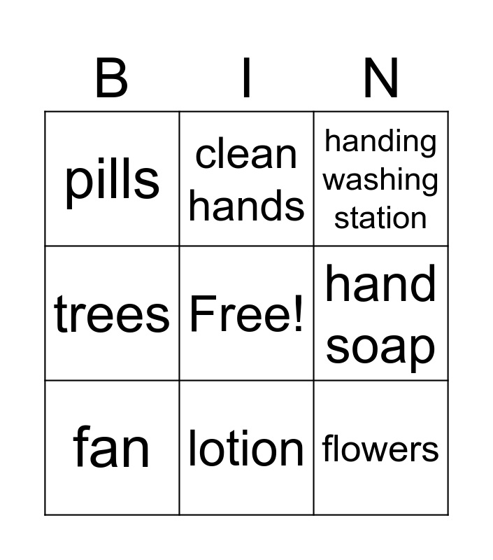 This bingo card has a free space and 8 words: hand soap, handing washing station, clean hands, fan, pills, flowers, trees and lotion.