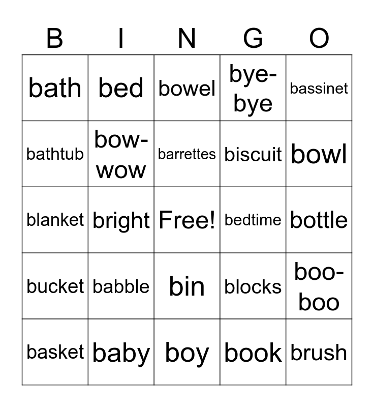 This bingo card has a free space and 24 words: babble, baby, barrettes, basket, bassinet, bath, bathtub, bed, bedtime, bin, biscuit, blanket, blocks, boo-boo, bow-wow, book, bottle, bowel, bowl, bright, brush, bucket, bye-bye and boy.