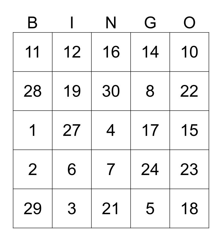 This bingo card has 25 words: 2, 3, 4, 5, 10, 11, 12, 16, 17, 23, 28, 19, 21, 24, 22, 29, 27, 30, 8, 15, 1, 6, 7, 14 and 18.