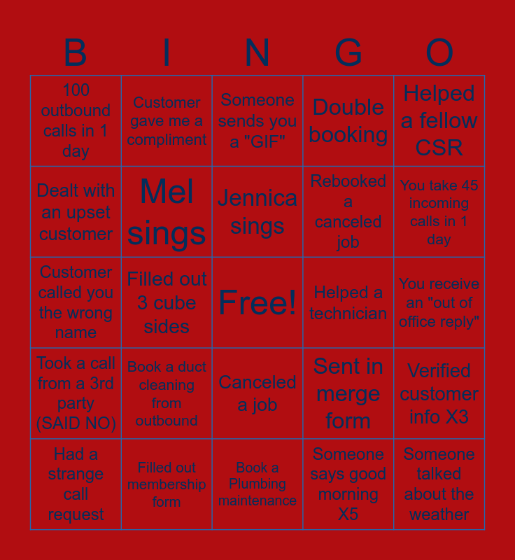 This bingo card has a free space and 24 words: Book a duct cleaning from outbound, Filled out membership form, Jennica sings, Had a strange call request, Helped a fellow CSR, 100 outbound calls in 1 day, Dealt with an upset customer, Customer gave me a compliment, Helped a technician, Canceled a job, Rebooked a canceled job, Customer called you the wrong name, Sent in merge form, Verified customer info X3, Mel sings, Someone says good morning X5, You receive an "out of office reply", Someone sends you a "GIF", You take 45 incoming calls in 1 day, Filled out 3 cube sides, Someone talked about the weather, Took a call from a 3rd party (SAID NO), Double booking and Book a Plumbing maintenance.