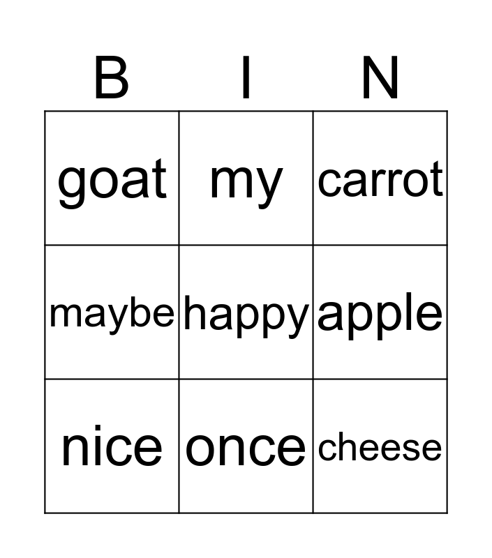 This bingo card has a free space and 8 words: apple, carrot, my, nice, goat, cheese, maybe and once.