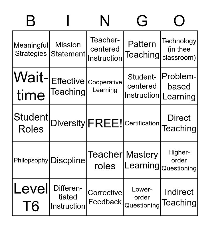 This bingo card has a free space and 24 words: Discpline, Differen-tiated Instruction, Cooperative Learning, Level T6, Technology (in thee classroom), Meaningful Strategies, Wait-time, Mission Statement, Certification, Teacher roles, Student- centered Instruction, Student Roles, Mastery Learning, Higher-order Questioning, Effective Teaching, Lower- order Questioning, Direct Teaching, Teacher- centered Instruction, Problem- based Learning, Diversity, Indirect Teaching, Philopsophy, Pattern Teaching and Corrective Feedback.