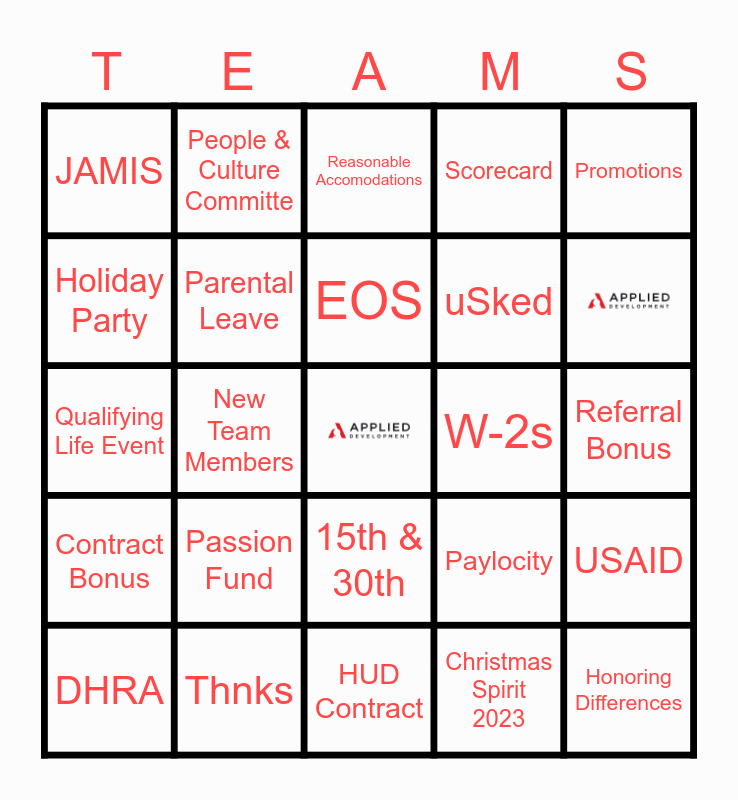 This bingo card has 1 images, a free space and 50 words: Level 10, Honoring Differences, AD Branding, HUD Contract, Passion Fund, Surverys, People & Culture Committe, Timesheet Submission, Holiday Party, Unlimited Leave, Parental Leave, Scorecard, USAID, Paylocity, Yearn to Learn, All Hands, EOS, W-2s, DCPAS, Promotions, New Team Members, Christmas Spirit 2023, JAMIS, uSked, 508 Compliance, What's in a Name, AD Newsletter, DHRA, Reasonable Accomodations, Strategic Communications, Shared Services, Work/Play/Life Integration, Spooky Season, Indigenous Peoples Day, Thnks, Blameless Problem Solving, MVP, Wellness Wednesdays, Core Values, Referral Bonus, Contract Bonus, Top Secret Clearance, Open Enrollment, Office Hours, ByteDance, Qualifying Life Event, Intiendo, 7th & 22nd, 15th & 30th and 9/80.